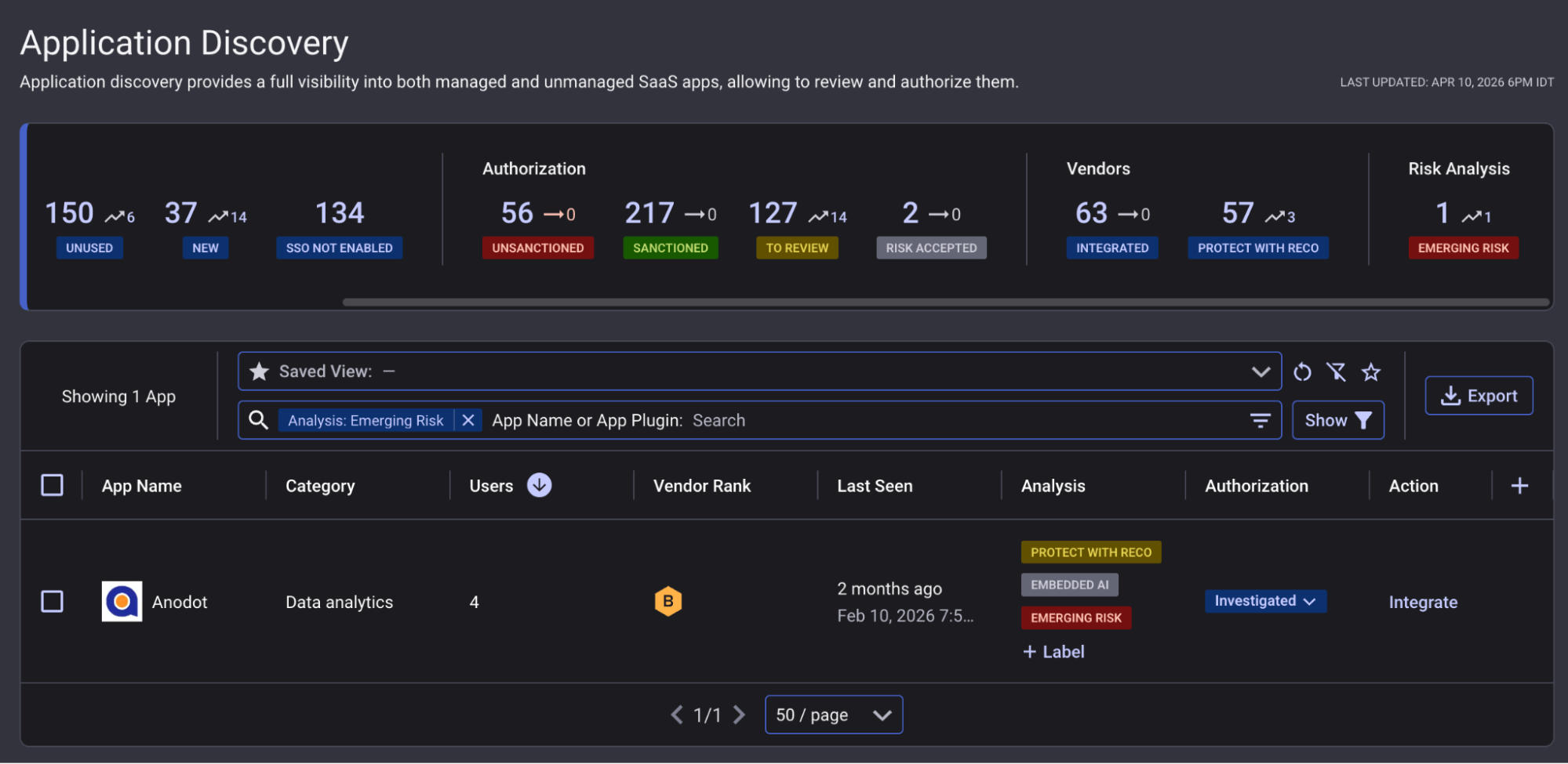 When a vendor like Anodot becomes the subject of an active breach, Reco automatically applies an “Emerging Risk” label to flag it across your app inventory, so security teams know immediately whether that vendor exists in their environment and who is using it without waiting for a manual investigation.