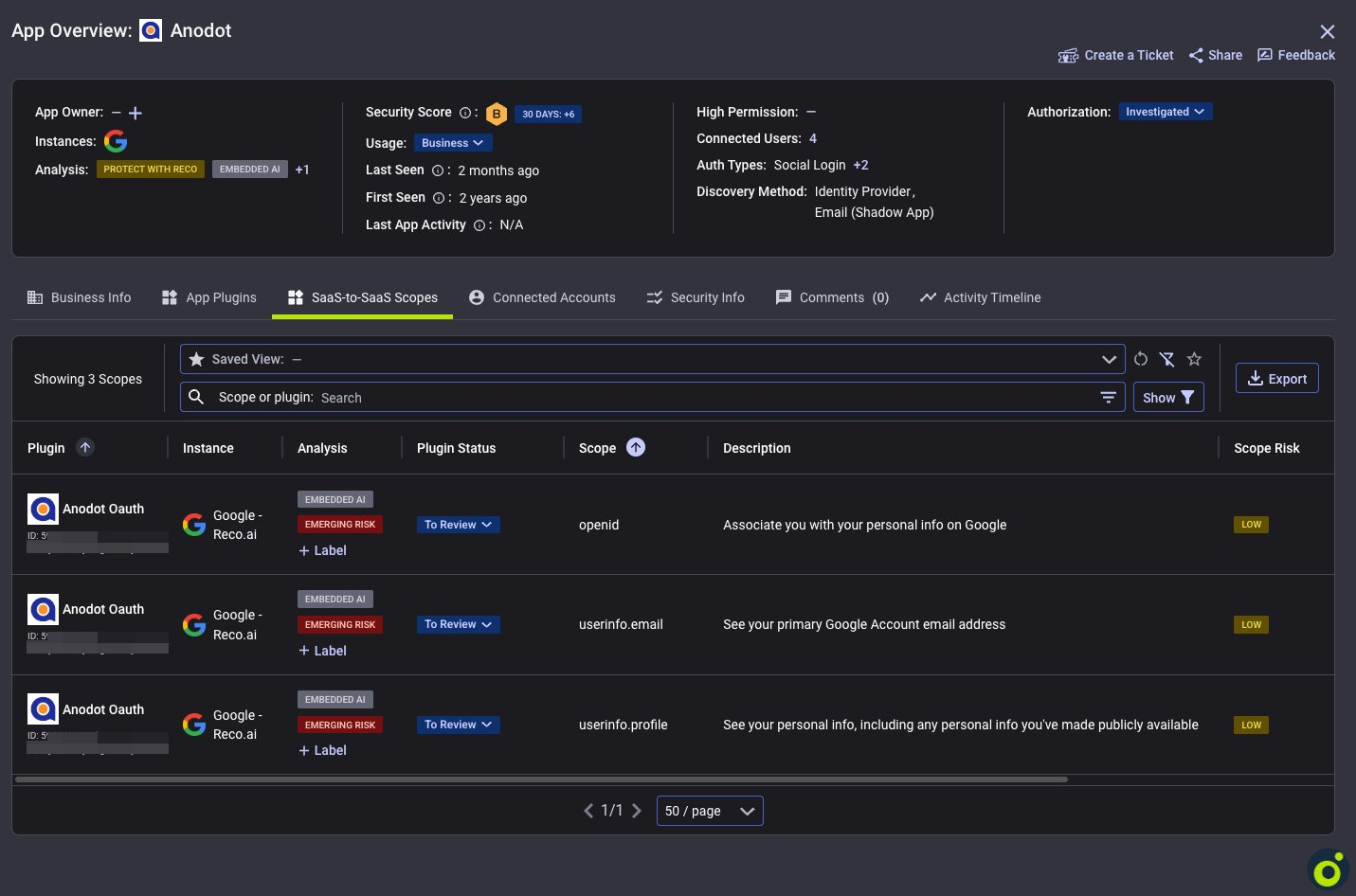 From the App Discovery view, teams can drill into the OAuth permissions and scopes each app holds making it immediately clear what data access a vendor like Anodot had and which users were connected.