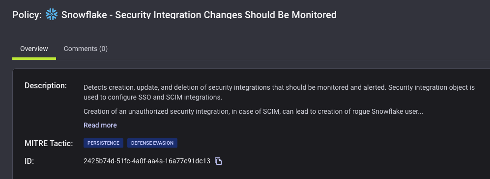 - Alert — Security Integration Changes — fires on any CREATE, ALTER, or DROP of a security integration.