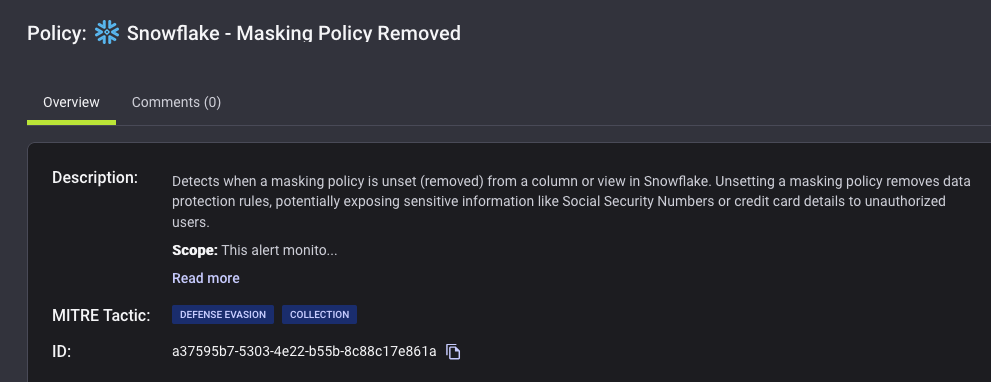 The Risk: Data masking is often the last line of defense for sensitive fields such as names, SSNs, financial data. Attackers who've gained access know this, and removing masking policies before exfiltration ensures the stolen data is unredacted and immediately monetizable. This step often happens in the window between initial access and bulk export. Making it a critical early warning signal.