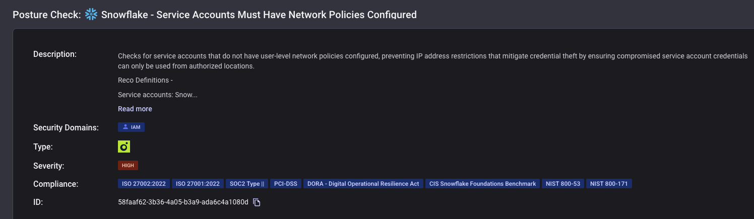- Posture Check — Service Account Network Policy — flags any Snowflake service account lacking a network policy.