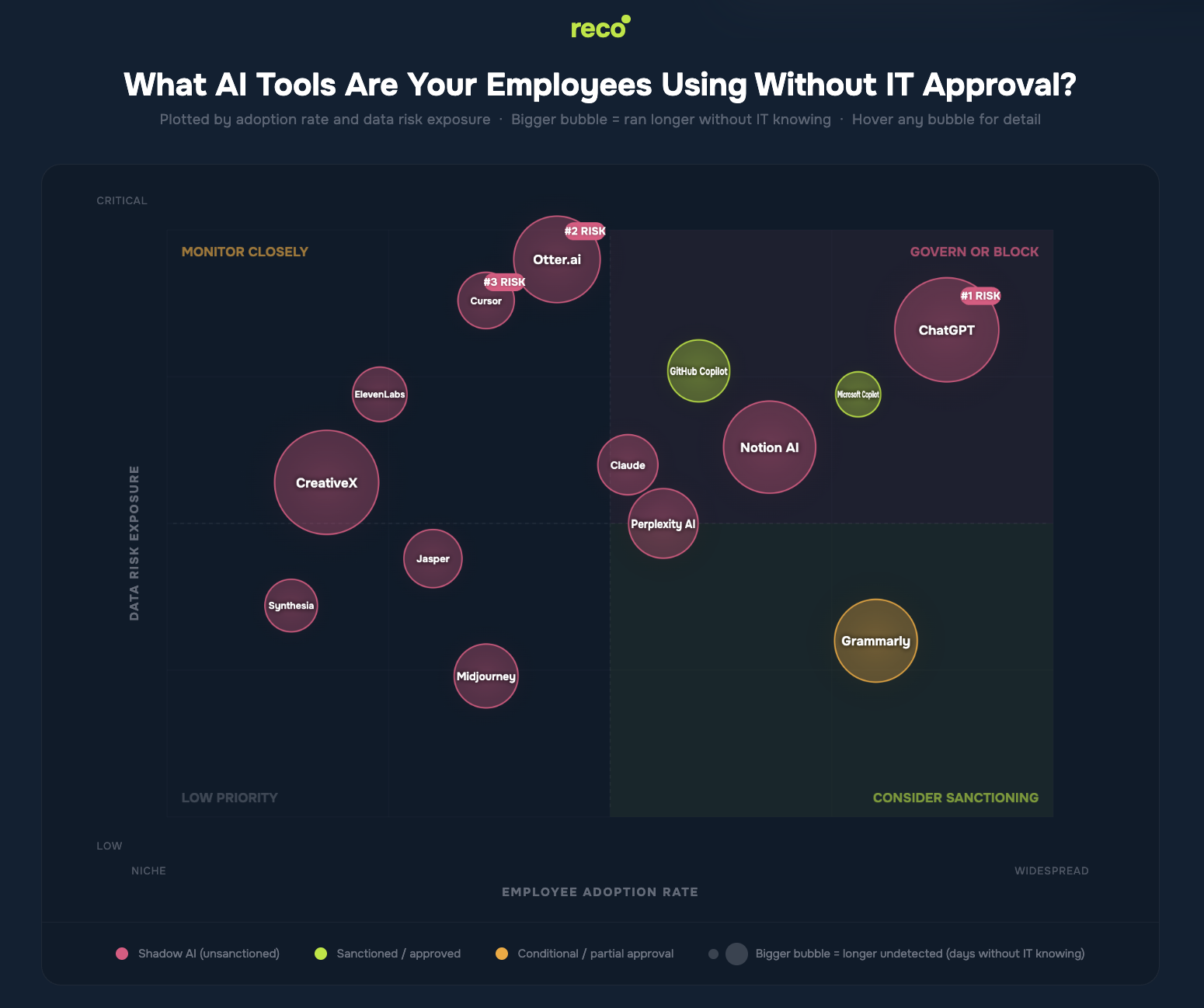 The chart below plots 14 common enterprise AI tools across two axes: employee adoption and the level of sensitive data each tool can access. Bubble size represents how long each tool typically operates before IT discovers it.