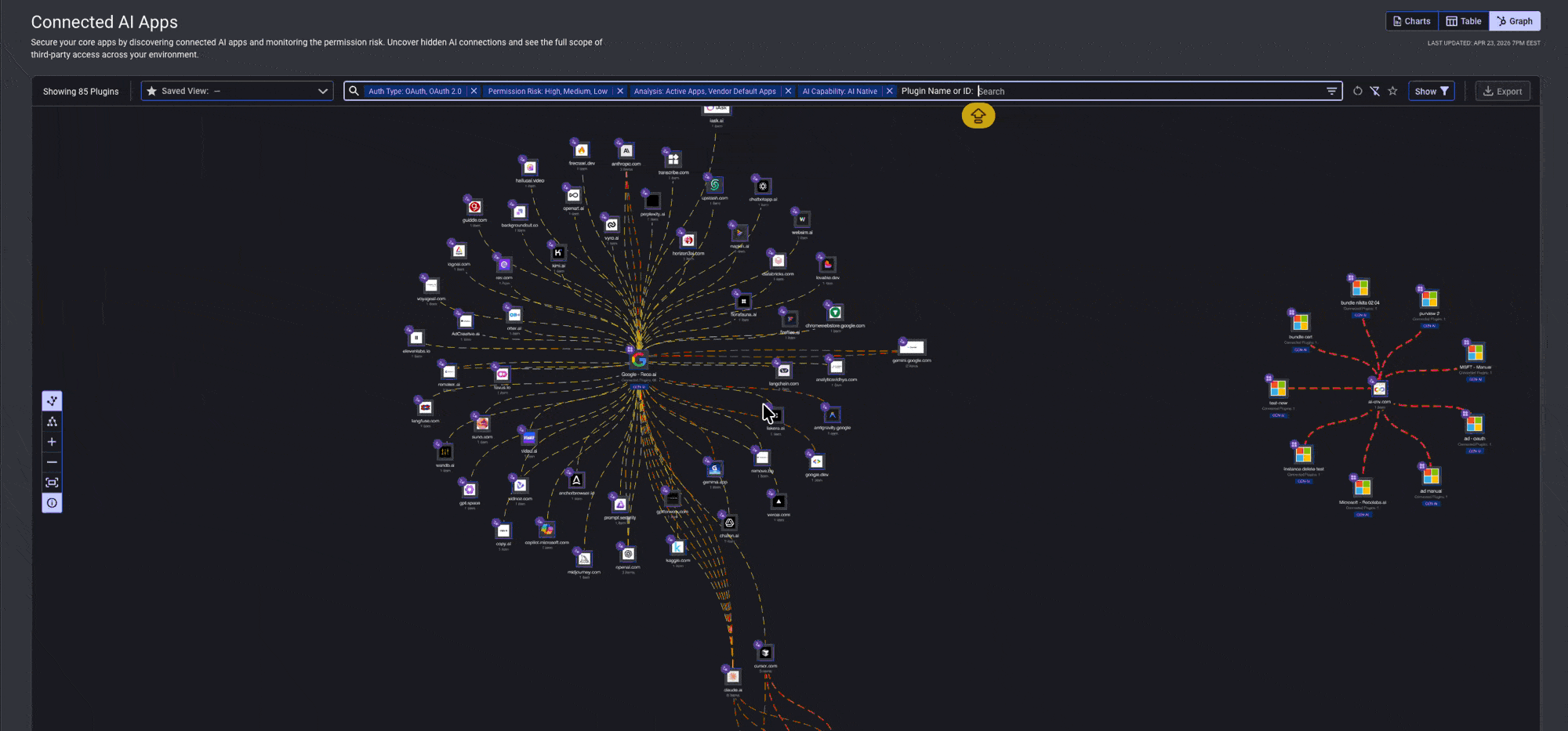 AI Discovery answers which AI apps exist. Connected AI Apps answers what they can access. Use the view toggle in the top right to switch between Charts, Table, and Graph. The Graph view maps every core app to its connected plugins, with line colors indicating OAuth scope risk.